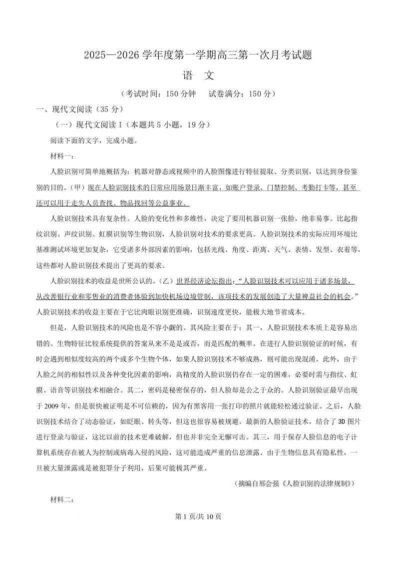 高三语文(原卷版)--海南省文昌中学2026届高三上学期第一次月考