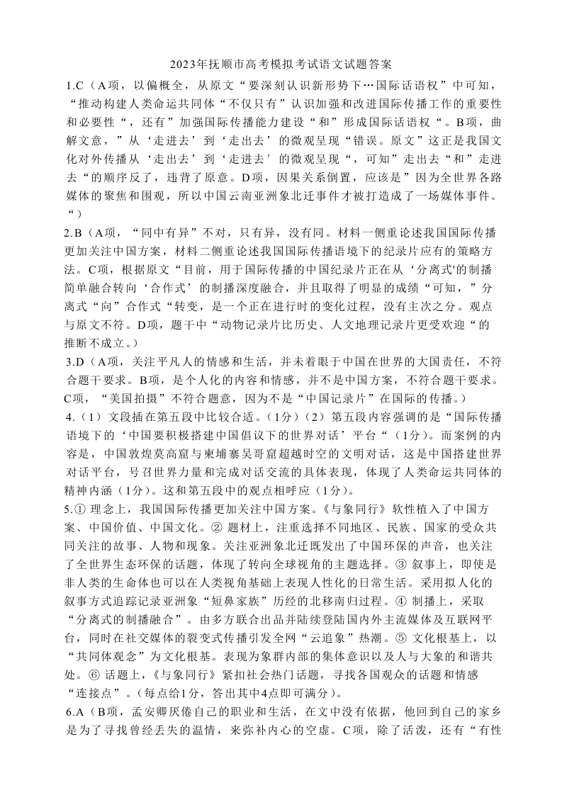 高三语文答案--辽宁省抚顺市普通高中2023高三第一次模拟考试