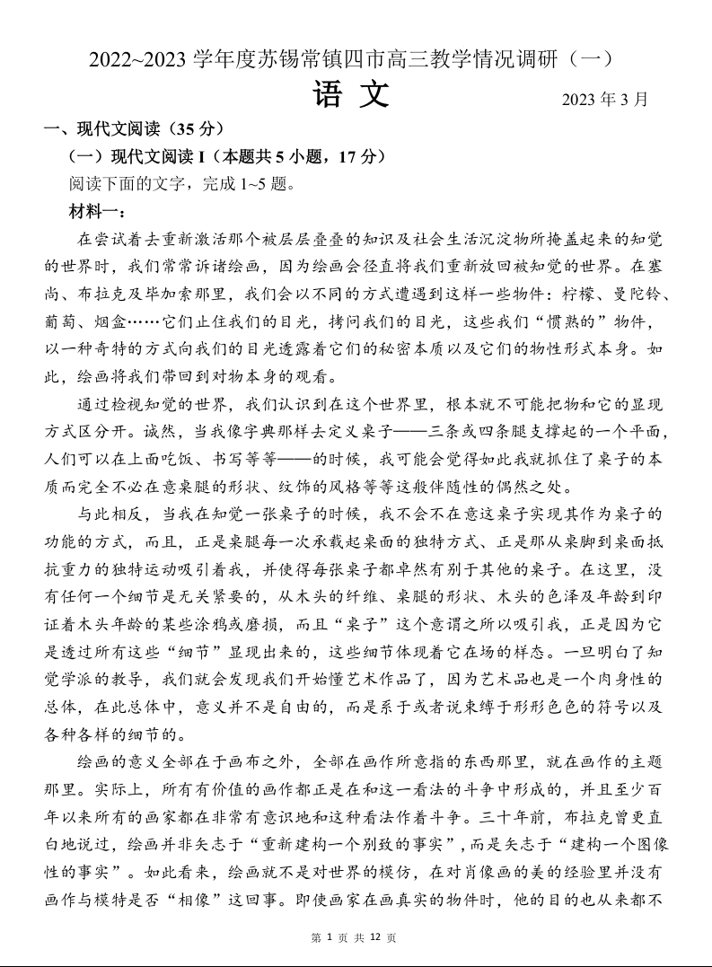 高三语文--江苏省苏锡常镇四市2023高三下学期教学情况调研(一)