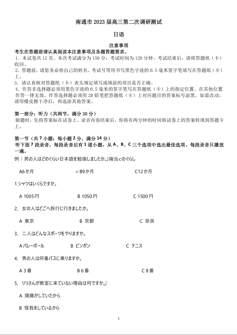 高三日语--江苏省苏北七市2023届高三第二次调研测试