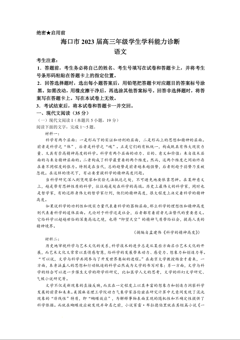 高三语文+答案--海南省海口市2023届高三年级学生学科能力诊断(文昌中学等多校模拟)