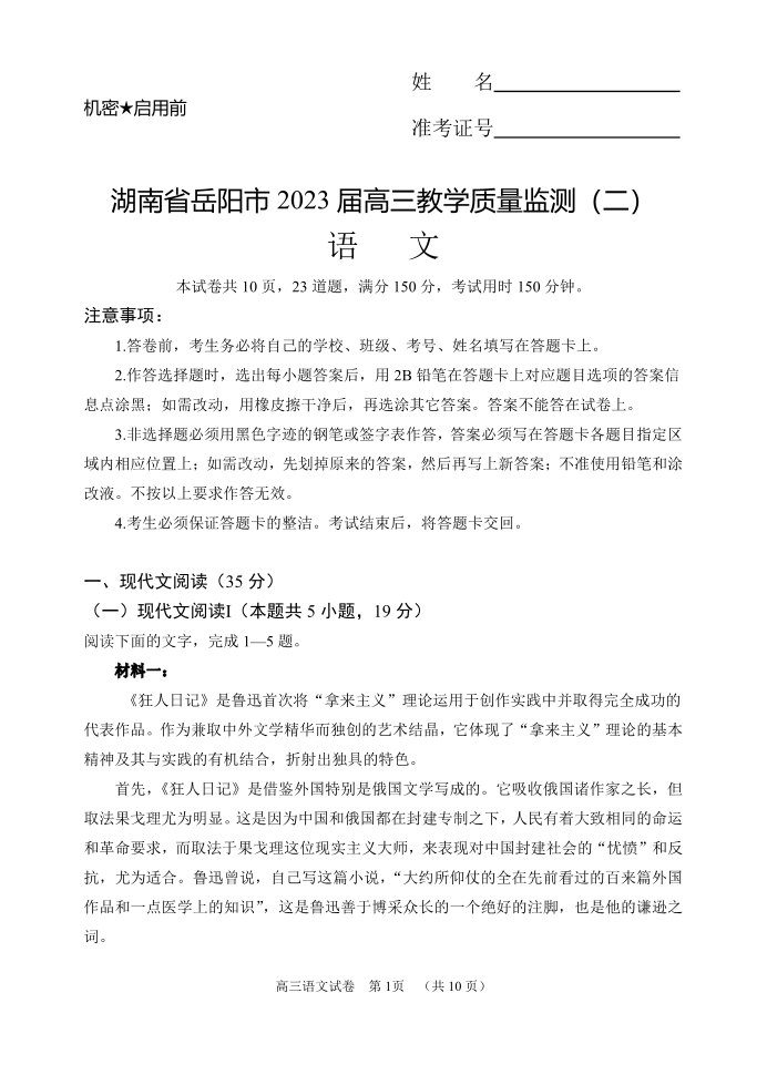 高三语文--湖南省岳阳市2023届高三下学期教学质量监测(二)
