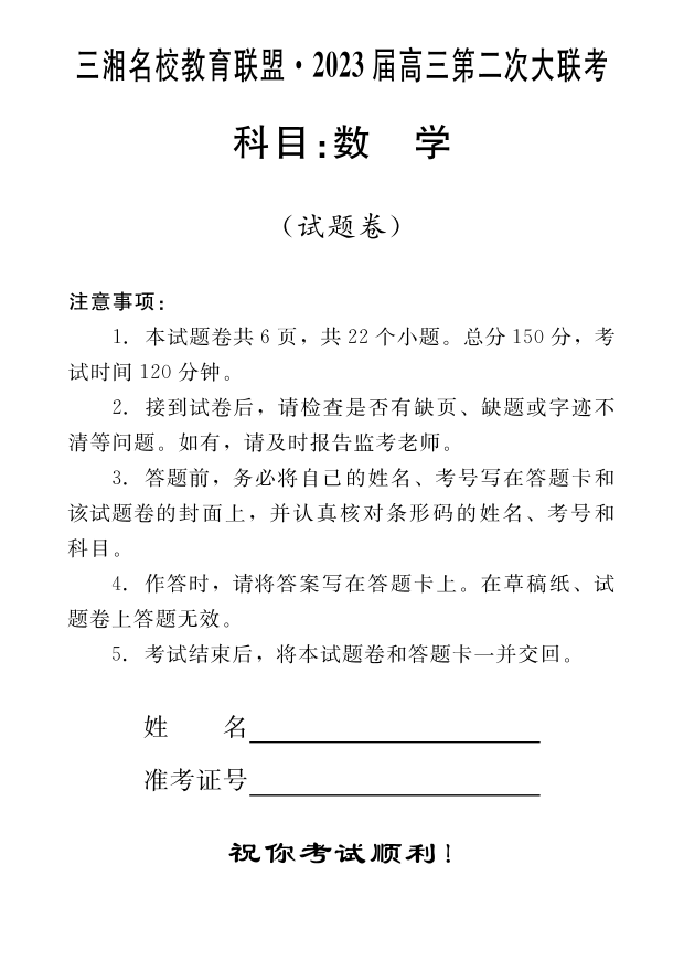 高三数学--湖南省三湘名校2023届高三第二次大联考