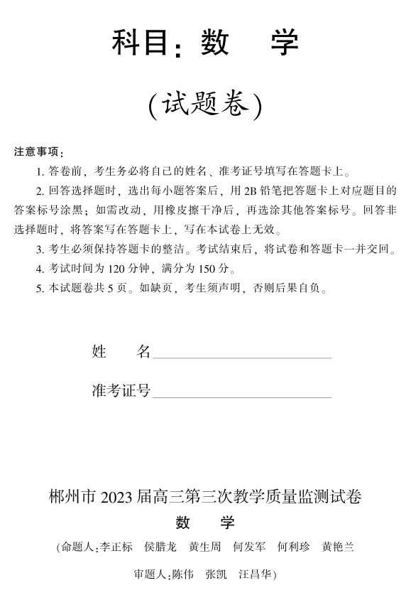 高三数学--湖南省郴州市2023届高三第三次质量检测