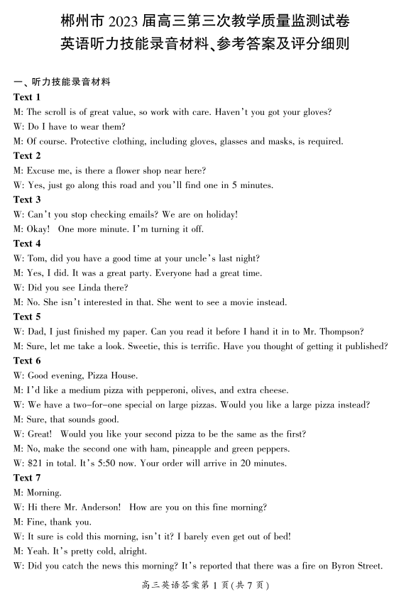 高三英语答案--湖南省郴州市2023届高三第三次质量检测