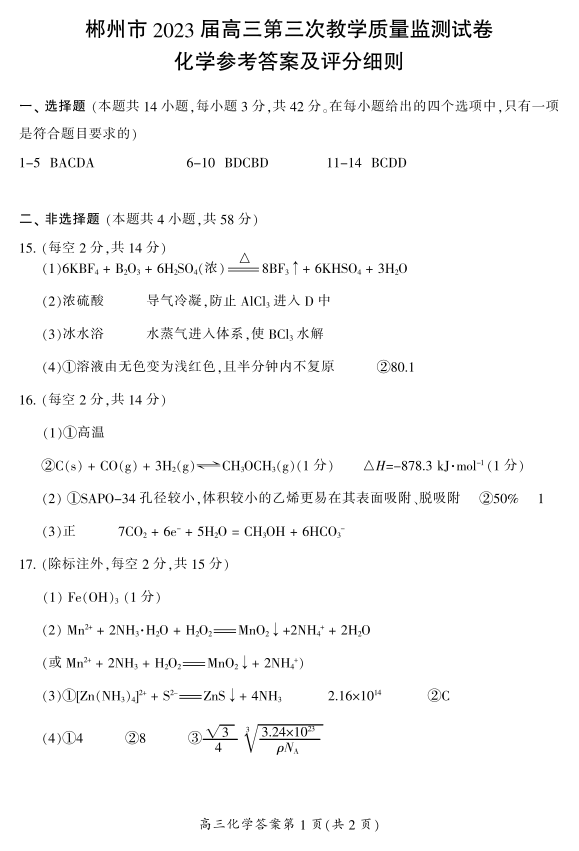 高三化学答案--湖南省郴州市2023届高三第三次质量检测