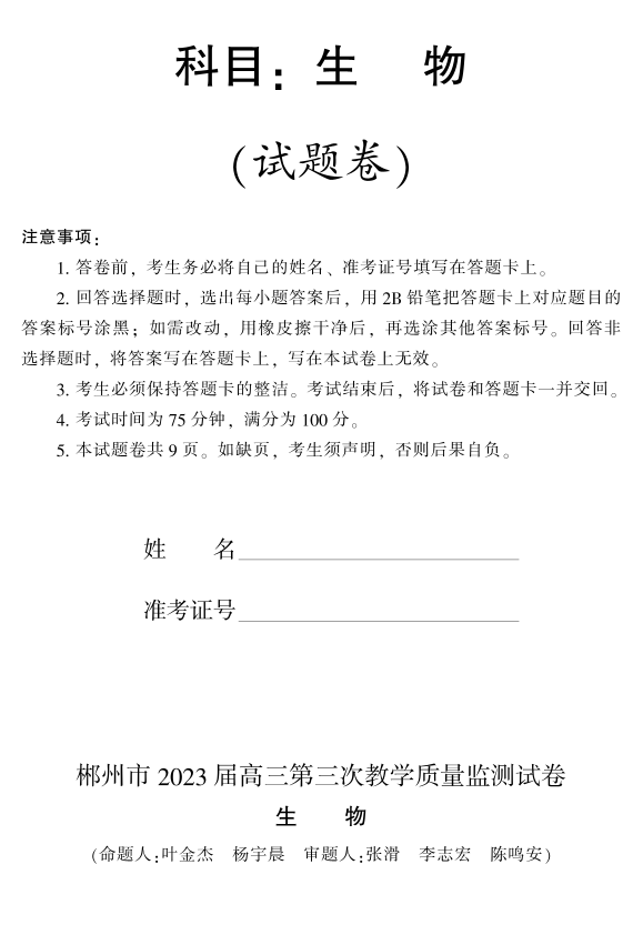 高三生物--湖南省郴州市2023届高三第三次质量检测