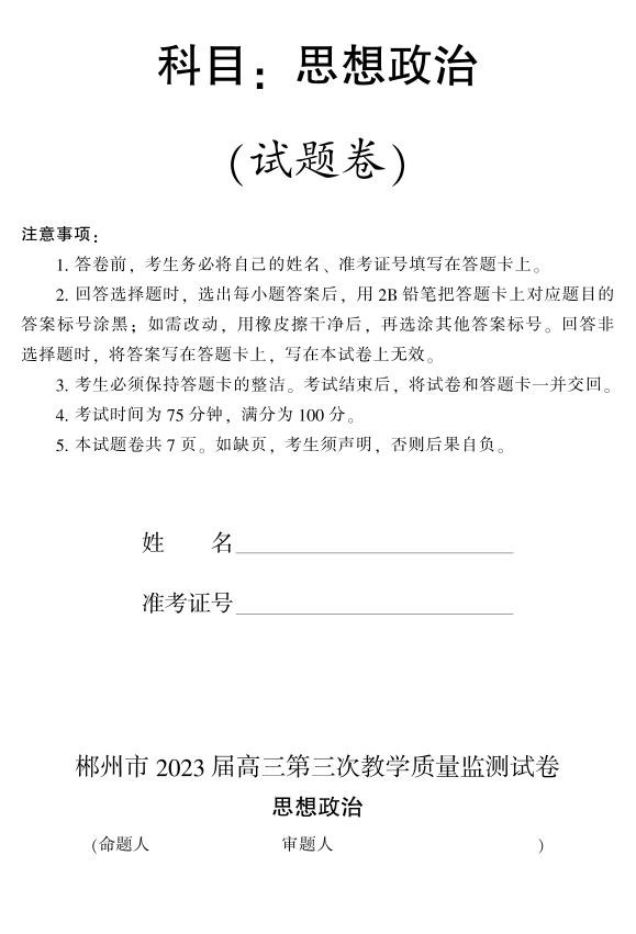 高三政治--湖南省郴州市2023届高三第三次质量检测