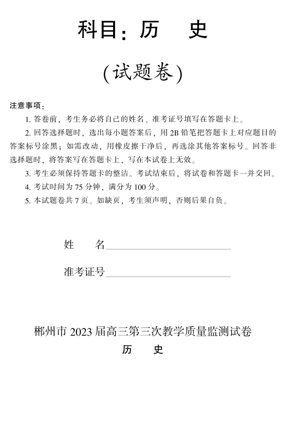 高三历史--湖南省郴州市2023届高三第三次质量检测