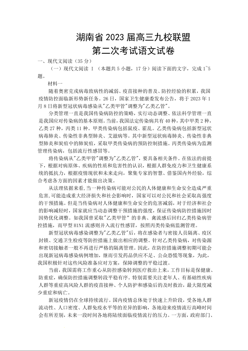 高三语文--湖南省2023届高三九校联盟第二次联考