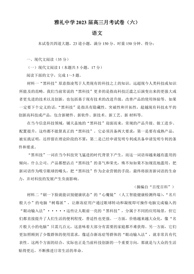 高三语文--湖南省长沙市雅礼中学2022-2023学年高三下学期月考卷(六)