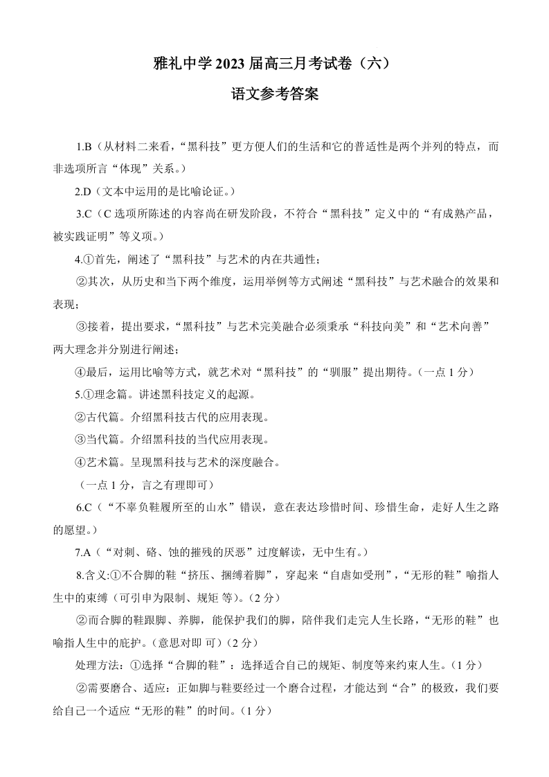 高三语文答案--湖南省长沙市雅礼中学2022-2023学年高三下学期月考卷(六)