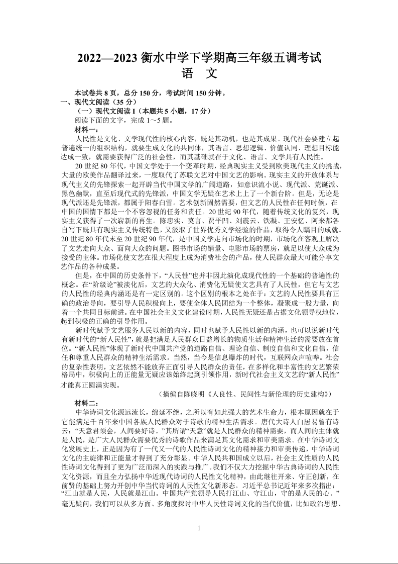高三语文+答案--河北省衡水中学2022-2023学年高三下学期五调考试