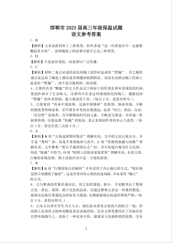 高三语文答案--河北省邯郸市2023届高三三模保温卷