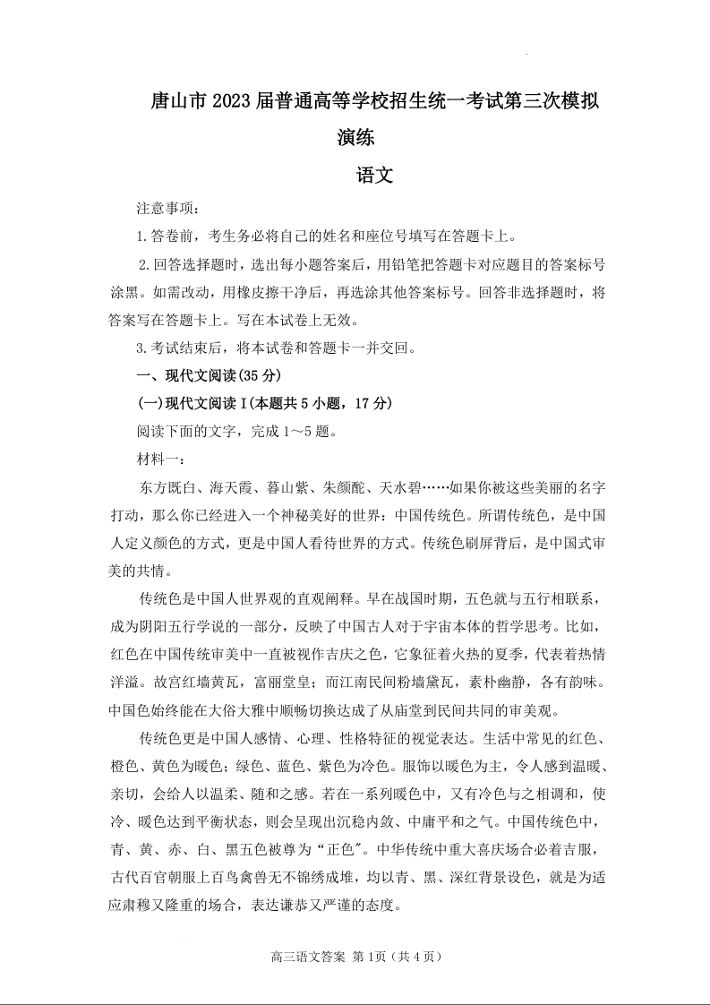 高三语文+答案--河北省唐山市2023届高三普通高等学校招生统一考试第三次模拟演练