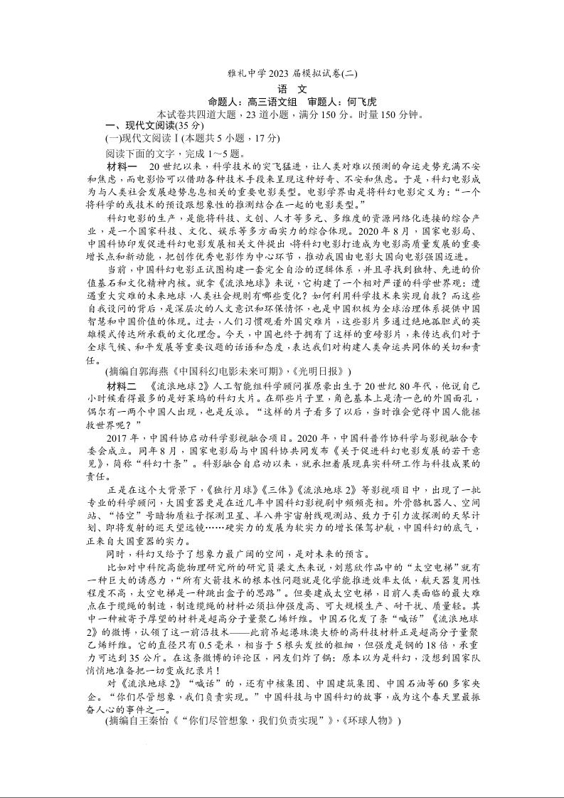高三语文--湖南省雅礼中学2023届高三模拟(二)