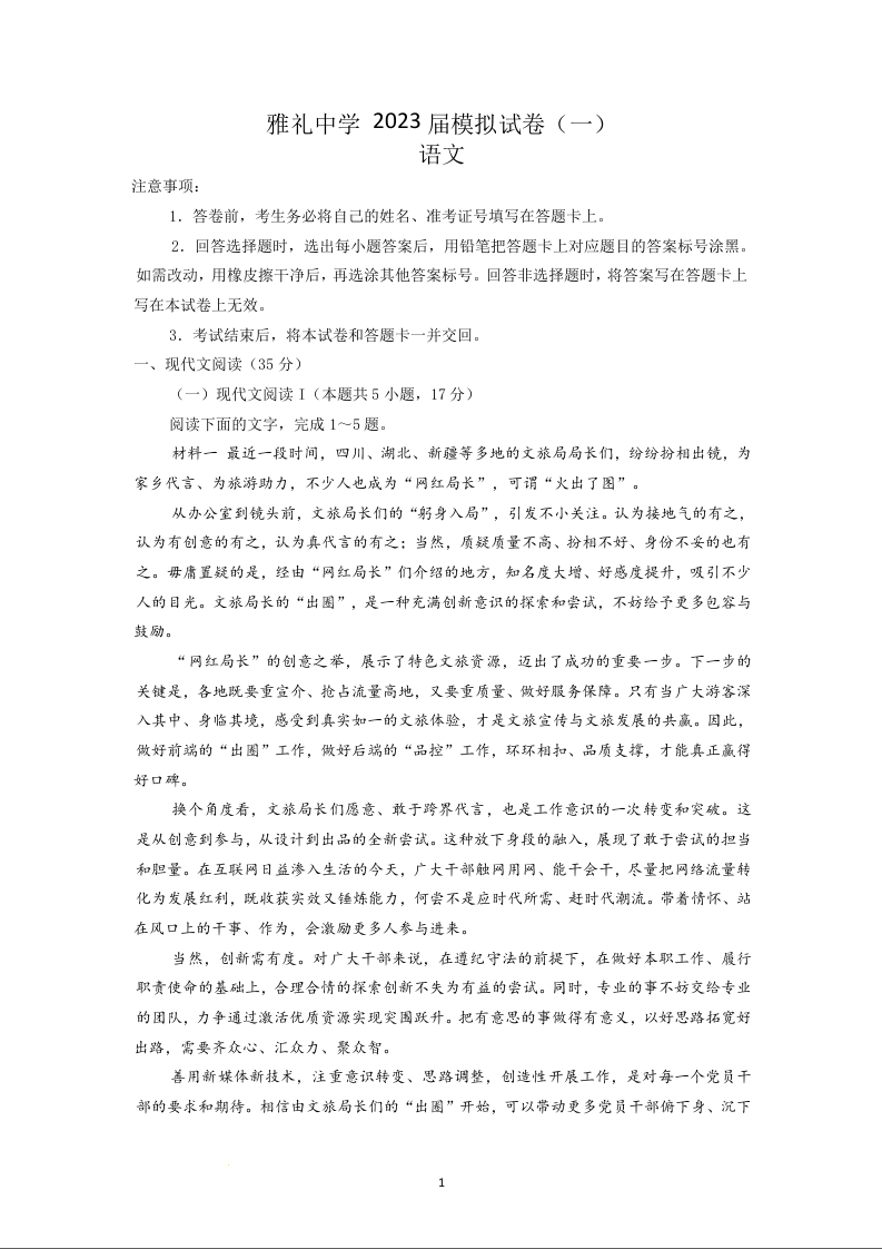 高三语文--湖南省长沙市雅礼中学2023届高考模拟试卷(一)