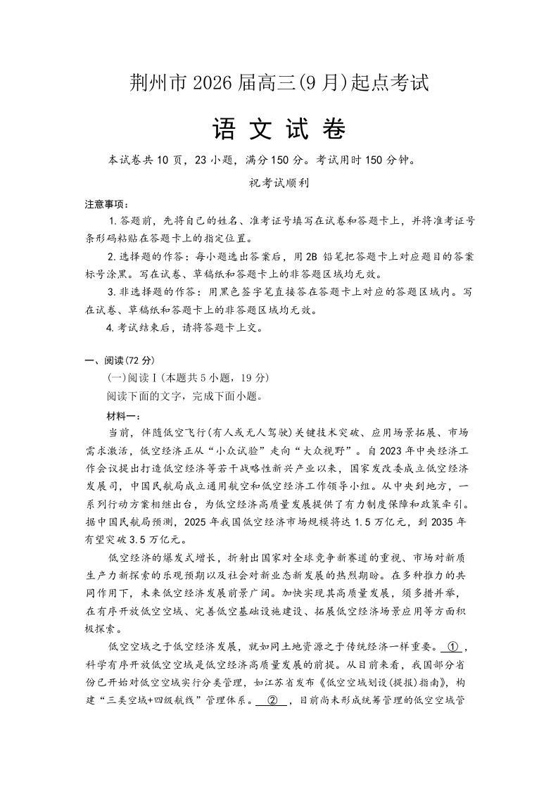 高三语文+答案--湖北省荆州市2026届高三上学期9月起点考试