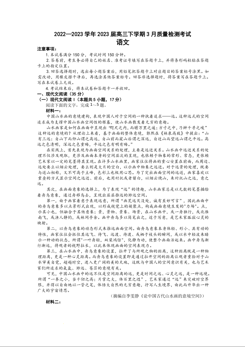 高三语文+答案--河北省石家庄部分重点高中2022-2023学年高三下学期3月月考