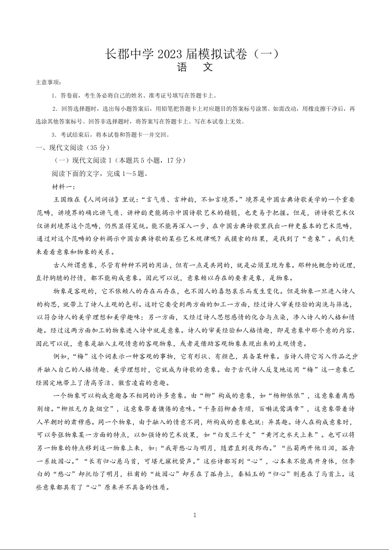 高三语文--湖南省长沙市长郡中学2023届高三一模