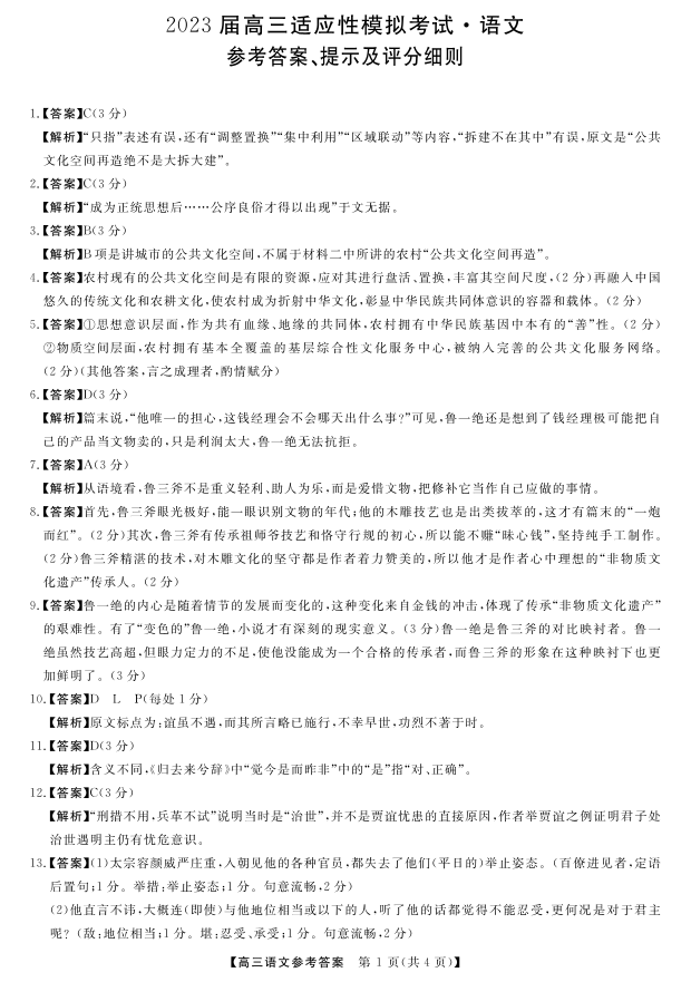 高三语文答案--湖南省郴州市2023届高三适应性模拟考试(郴州三模)