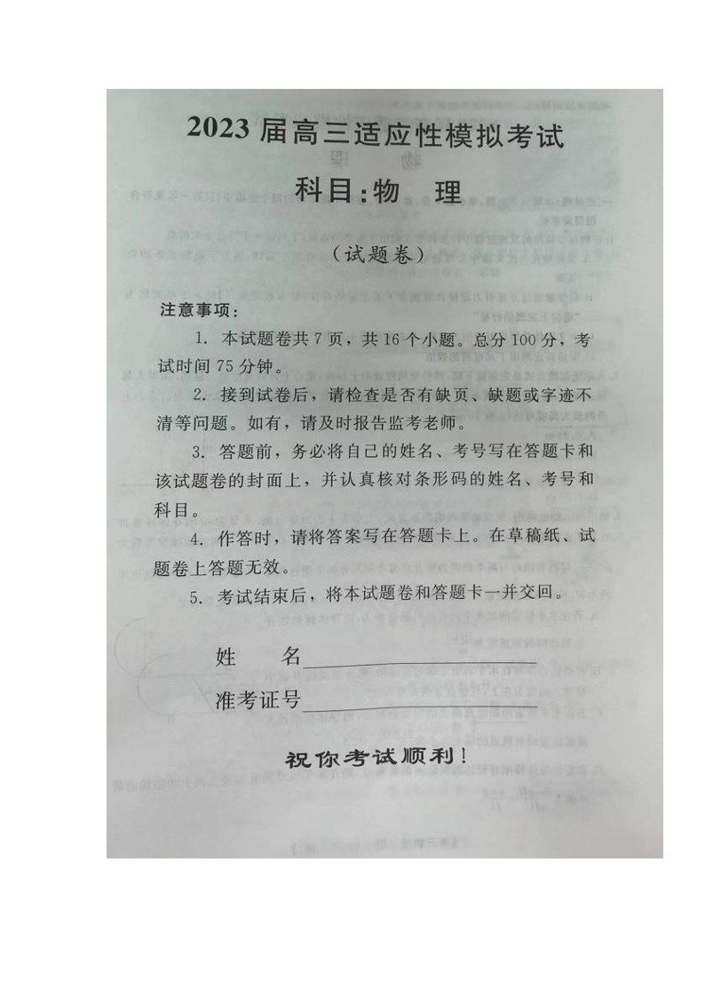 高三物理--湖南省郴州市2023届高三适应性模拟考试(郴州三模)