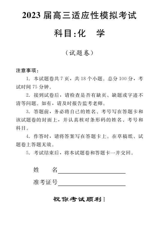 高三化学--湖南省郴州市2023届高三适应性模拟考试(郴州三模)