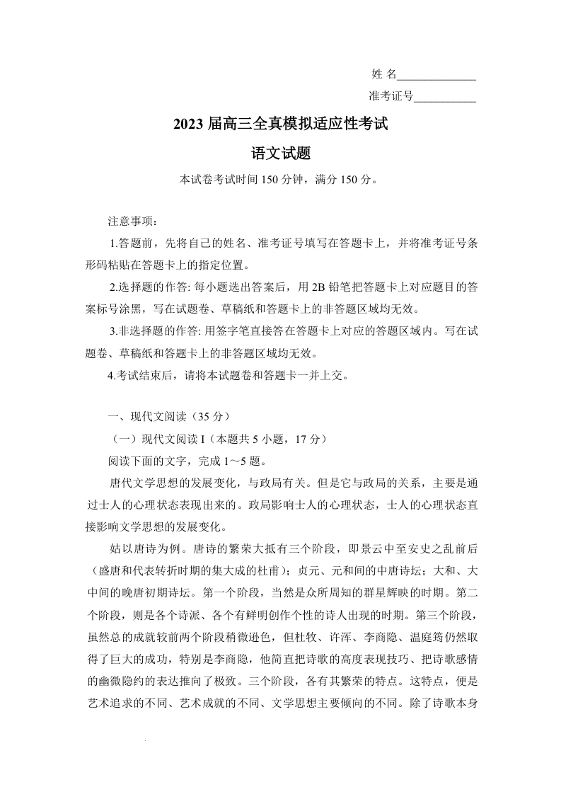 高三语文--湖南省衡阳市2023届名校协作体高三下学期全真模拟适应性考试(三模)