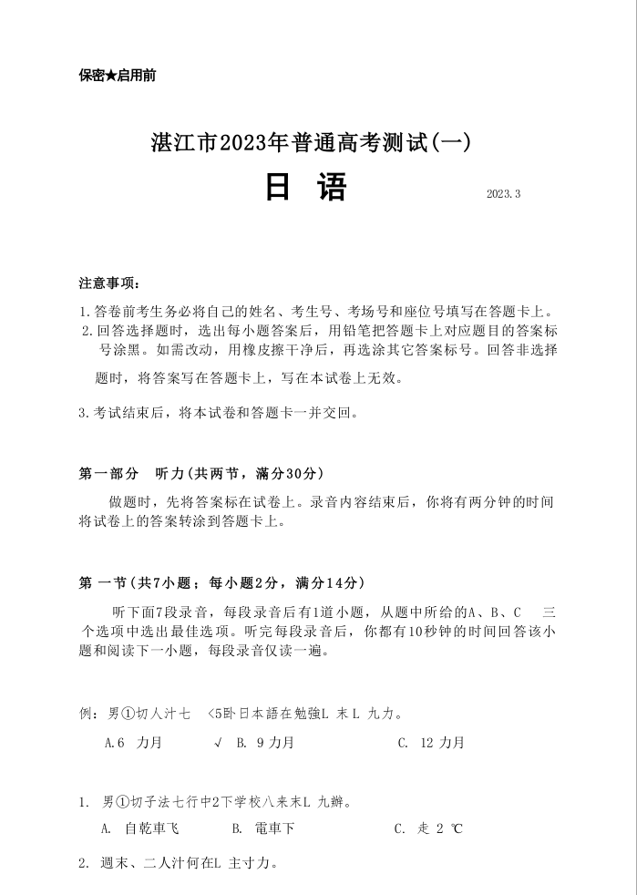 高三日语--广东省湛江市2023届普通高考测试(一)(一模)
