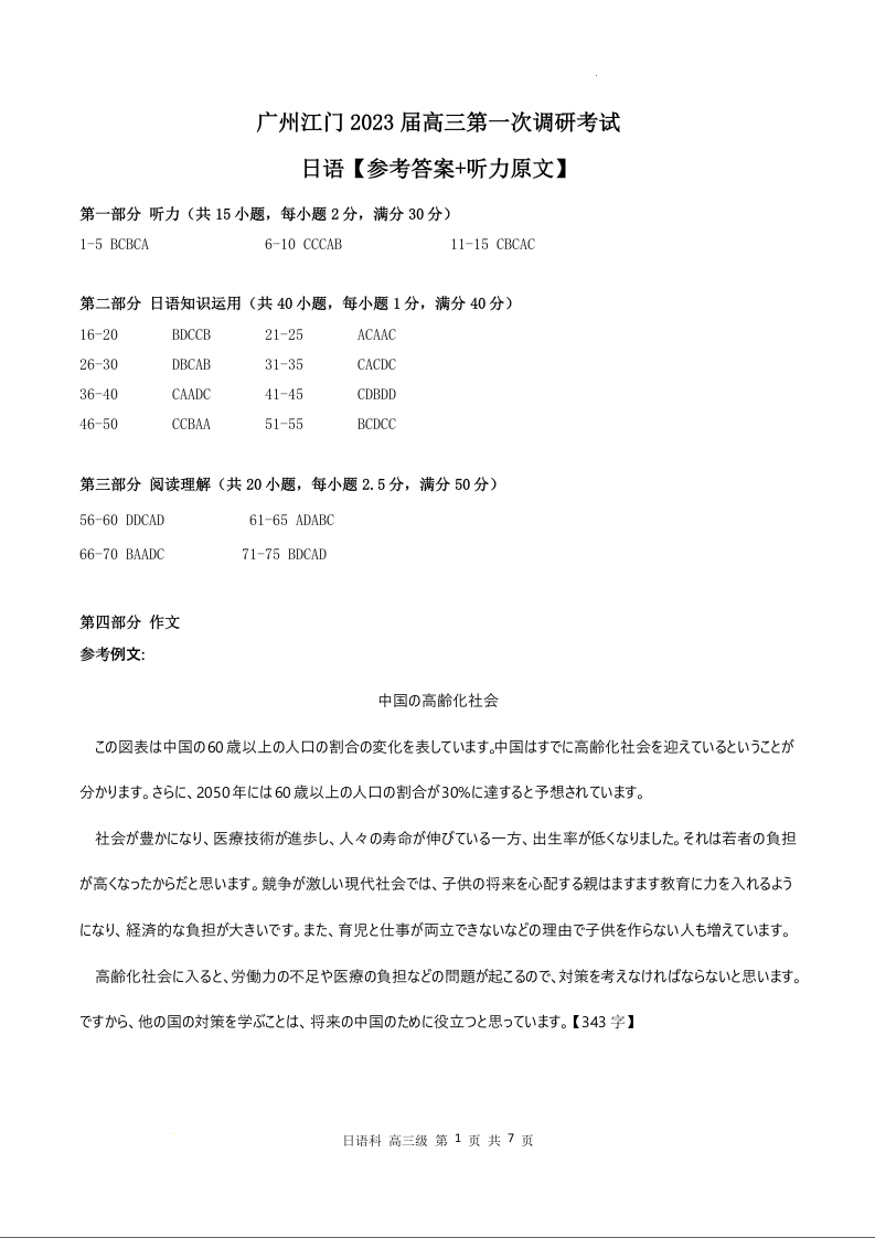 高三日语答案--广东省江门市2023届高考模拟考试(一模)