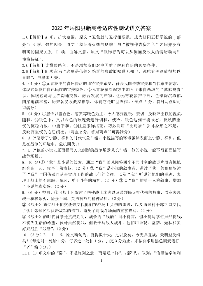 高三语文答案--湖南省岳阳市2023届高三新高考适应性测试
