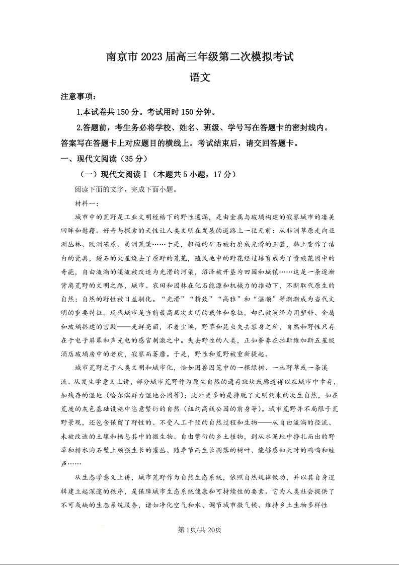 高三语文(解析版)--江苏省南京市2023届高三5月第二次模拟考试(南京三模)