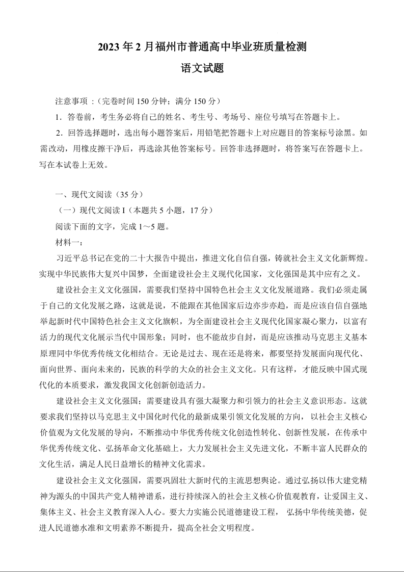 高三语文--福建省福州市2023届高三普通高中毕业班质量检测(二检)