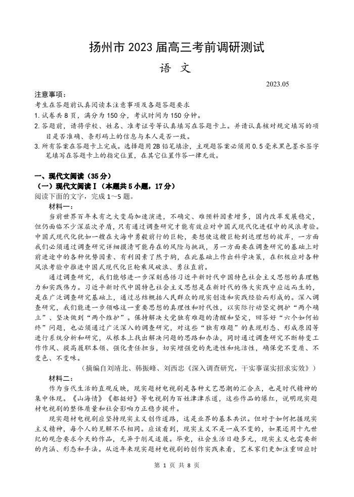 高三语文--江苏省扬州市2023届高三下学期调研测试(三模)