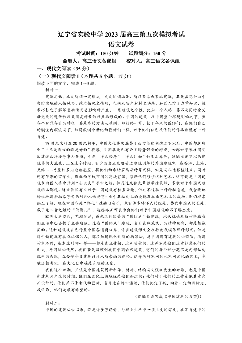 高三语文+答案--辽宁省实验中学2023届高三第五次模拟考试