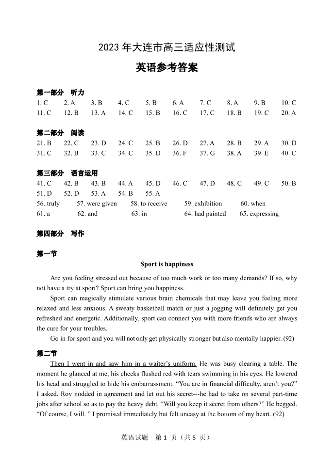 高三英语答案--辽宁省大连市2023届高三适应性测试(二)(大连二模)