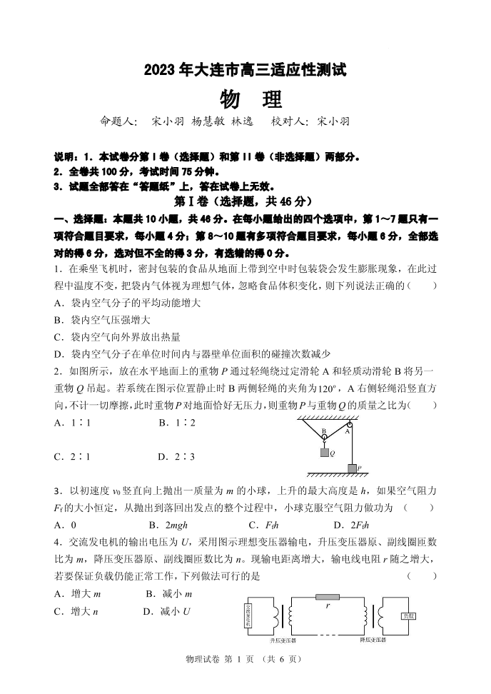 高三物理--辽宁省大连市2023届高三适应性测试(二)(大连二模)