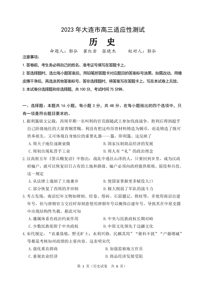 高三历史--辽宁省大连市2023届高三适应性测试(二)(大连二模)