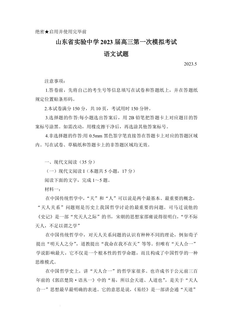 高三语文--山东省实验中学2023届高三第一次模拟考试