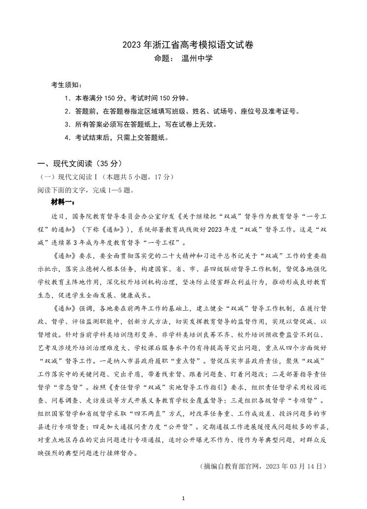 高三语文--浙江省高考四校联盟2023高三模拟卷(杭州二中、温州中学、金华一中、绍兴一中)