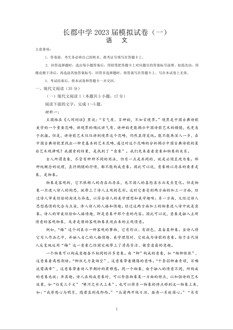 高三语文--湖南省长沙市长郡中学2023届高三下学期模拟(一)