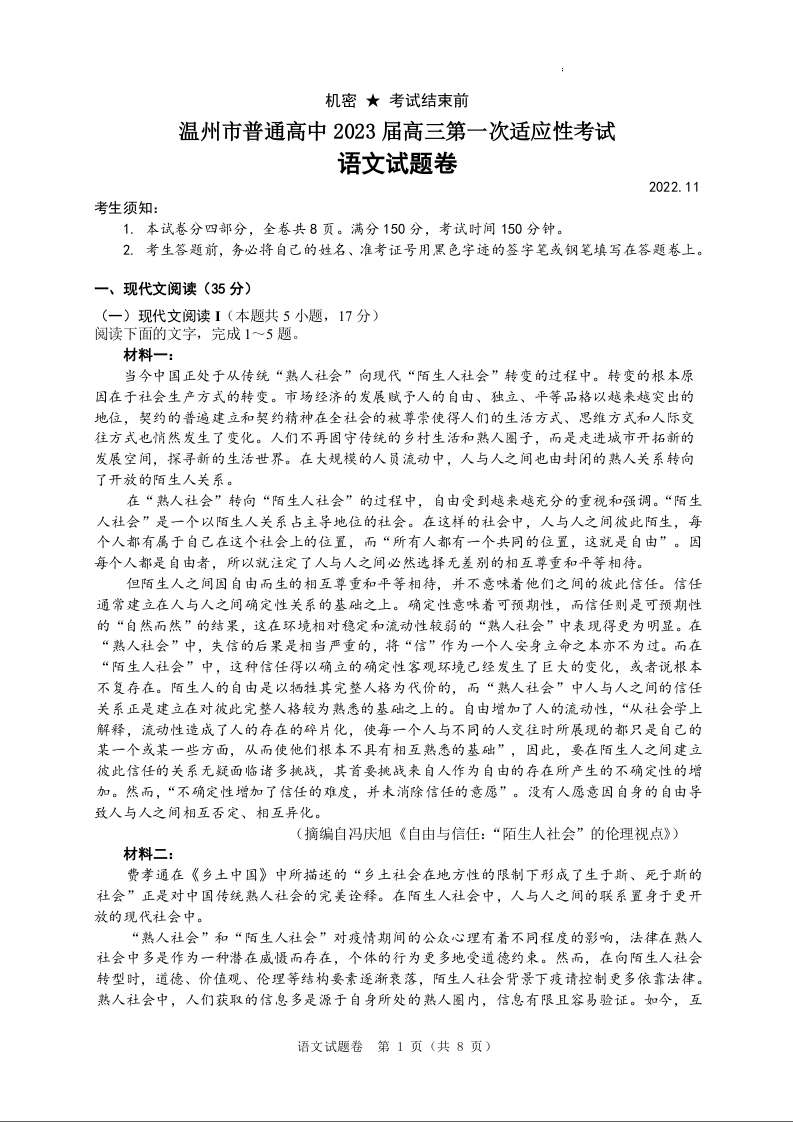 高三语文+答案--浙江省温州市普通高中2023届高三第一次适应性考试(一模)
