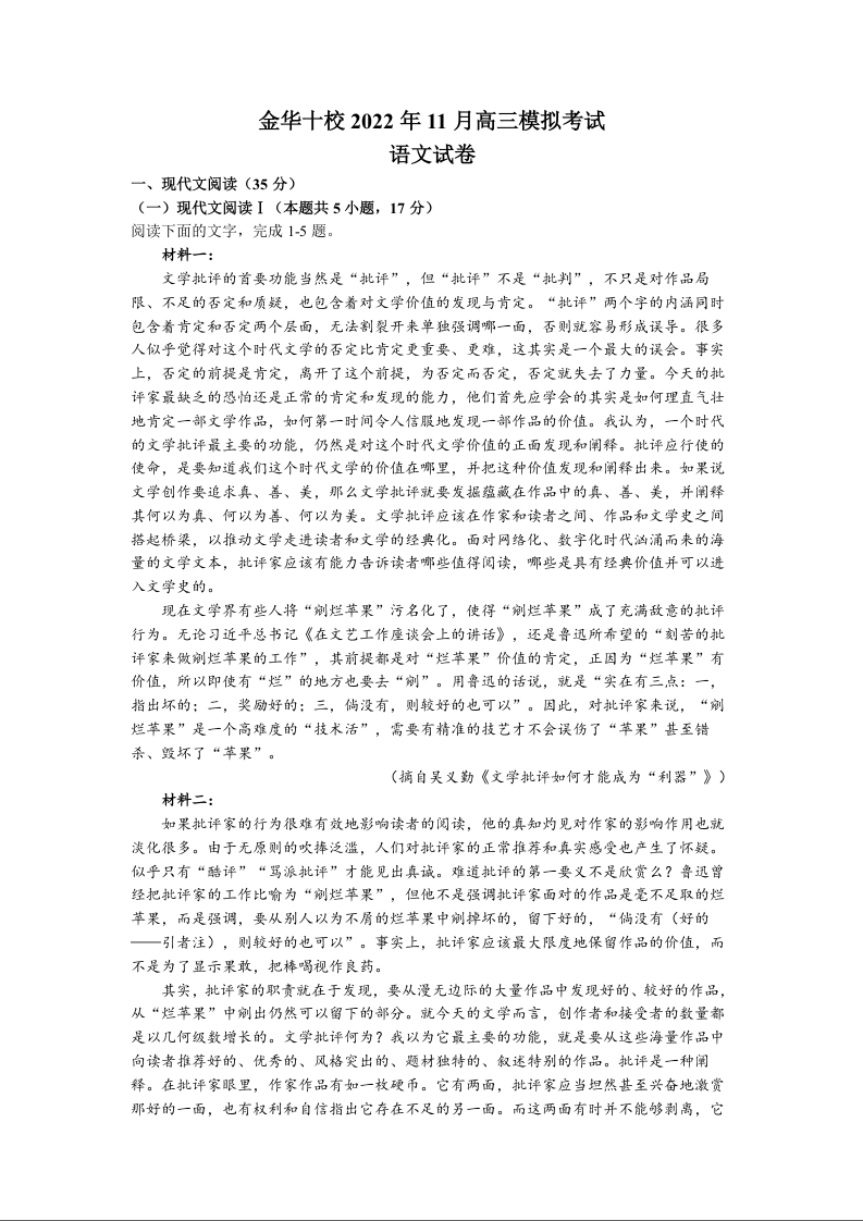 高三语文+答案--浙江省金华十校2023届高三一模