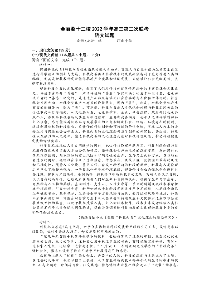高三语文--浙江省金丽衢十二校2023届高三下学期第二次联考