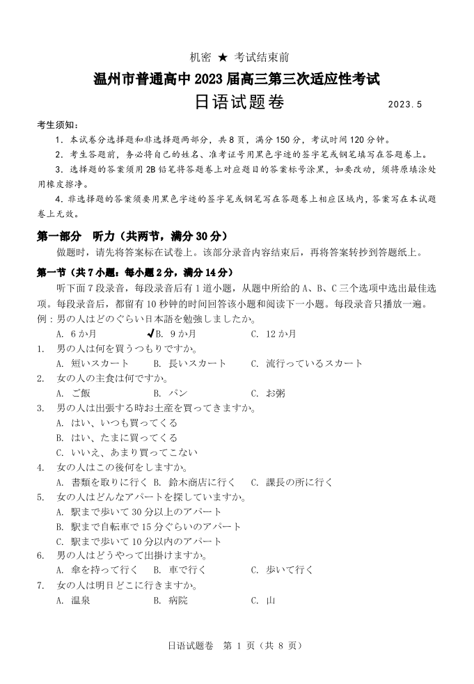 高三日语--浙江省温州市2023届高三三模