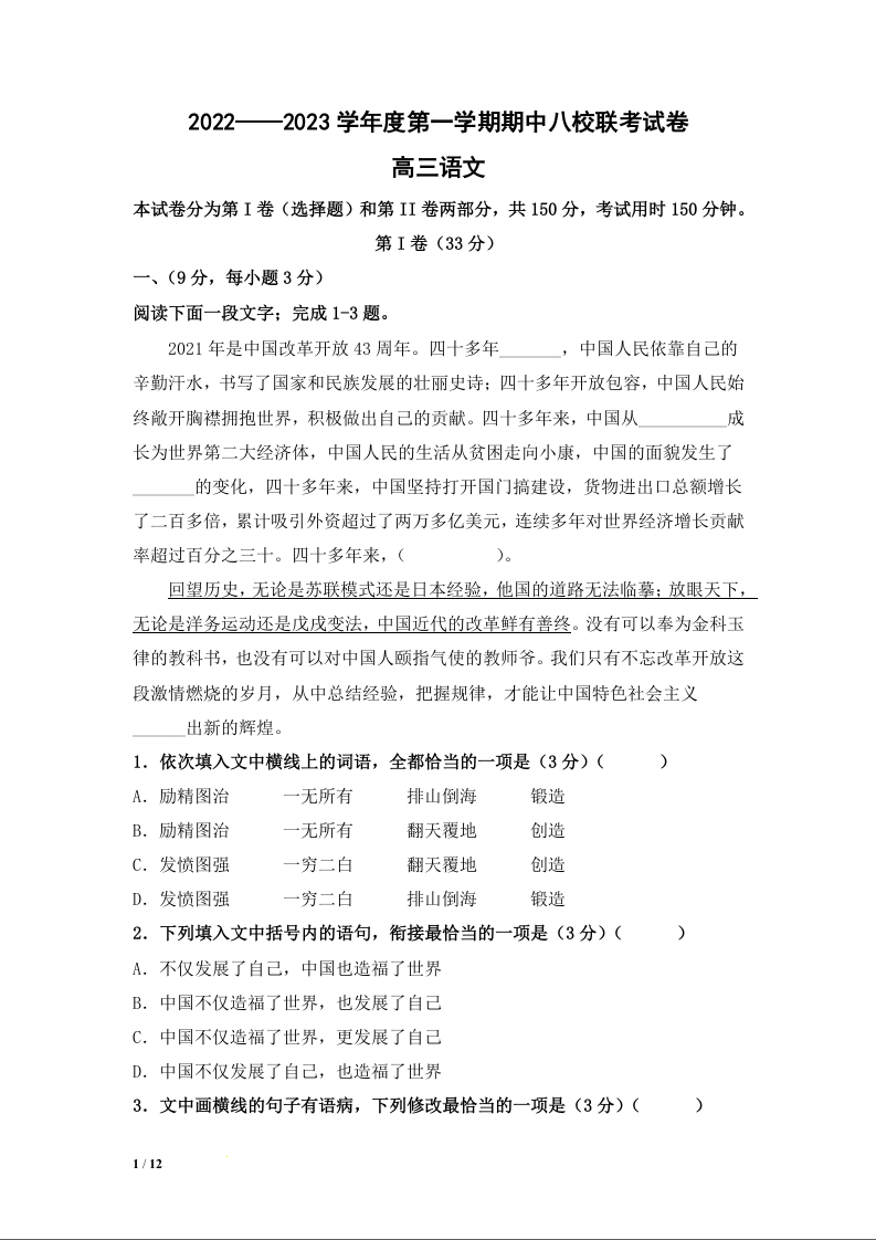 高三语文--天津市八校联考2023高三上学期期中考试