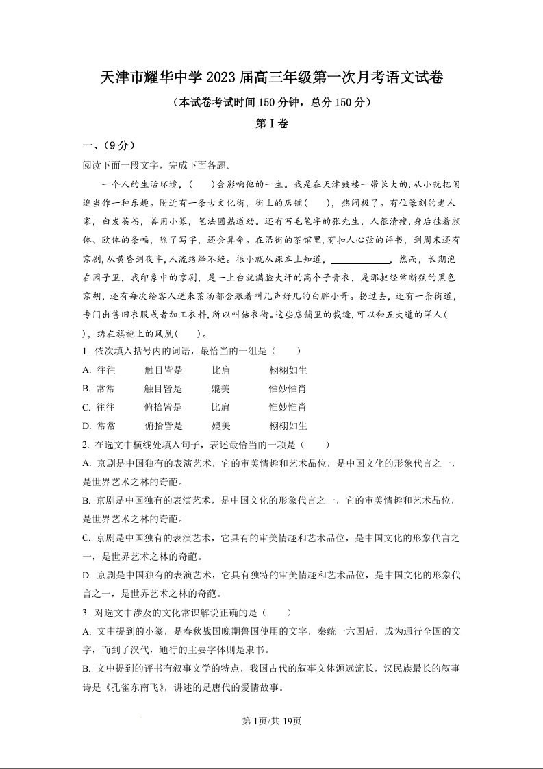 高三语文答案--天津市耀华中学2023届高三上学期第一次月考