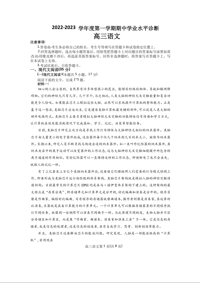 高三语文--山东省烟台市2022-2023学年高三上学期期中考试
