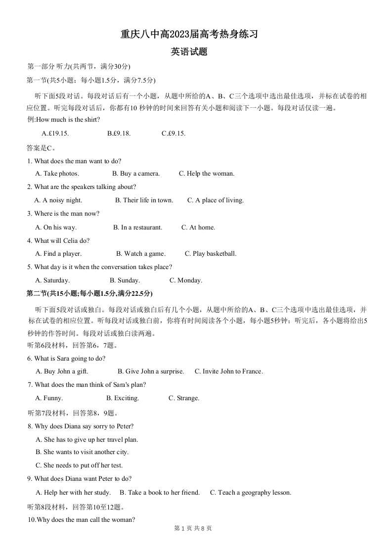 高三英语--重庆市第八中学高2023届高三(下)热身练习