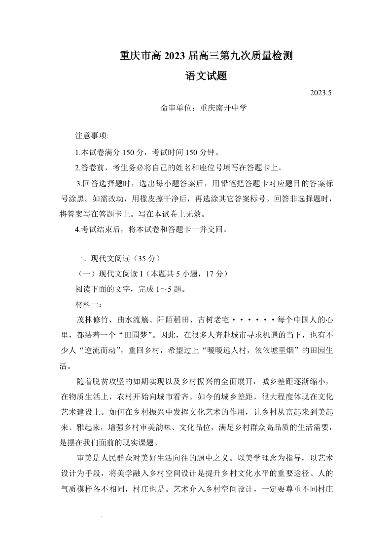 高三语文--重庆市南开中学高2023届高三第九次质量检测